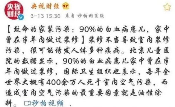 據央視報道,根據北京兒童醫(yī)院的數據顯示,90%的白血病患兒家中曾在半年內做過裝修。事實上,人們每天平均有2/3的時間在室內度過,室內環(huán)境污染對兒童、孕婦的損害更為嚴重。在房子裝修過程中,地面、墻面裝飾材料是最大污染源之一。